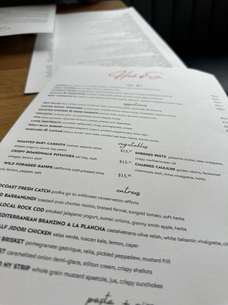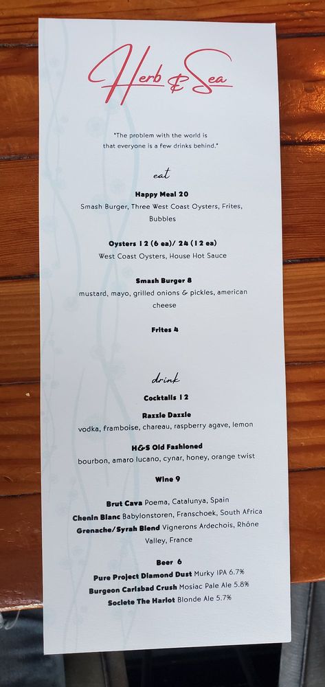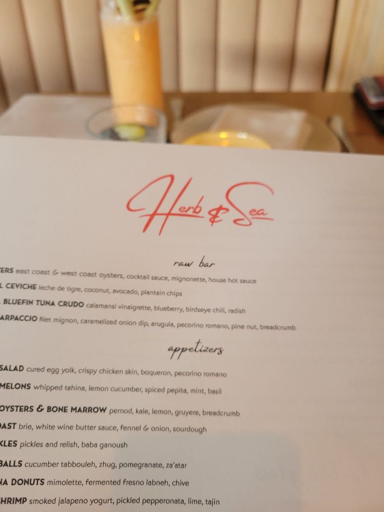 "Herb & Sea" located in Encinitas, CA offers a blend of New American, Seafood, and Pizza in a trendy, upscale setting. With a diverse menu featuring options like Baja Shrimp Cocktail, Burrata & Tomatoes, Plancha Fired Whole Branzino, Wood Fired Eye of Rib, and Fennel Sausage Pizza, this restaurant caters to a variety of tastes. Customers rave about the fresh and flavorful dishes, with favorites including the roasted carrots, tuna crudo, and mussels over sourdough bread. The friendly and knowledgeable staff add to the overall dining experience, making it a top choice for those looking for a memorable meal. The chic ambiance and creative menu options make Herb & Sea a must-visit for food enthusiasts seeking a unique dining experience.